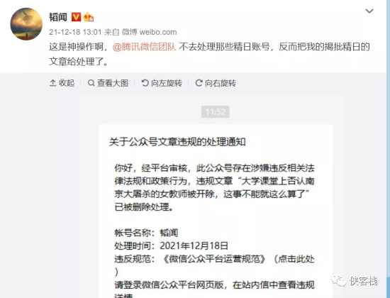 然后呢, 魔幻的一幕出现了,这些账户不知道有没有处理,韬哥揭批精日的文章倒被处理了,理由是“涉嫌违反相关法律法规”。