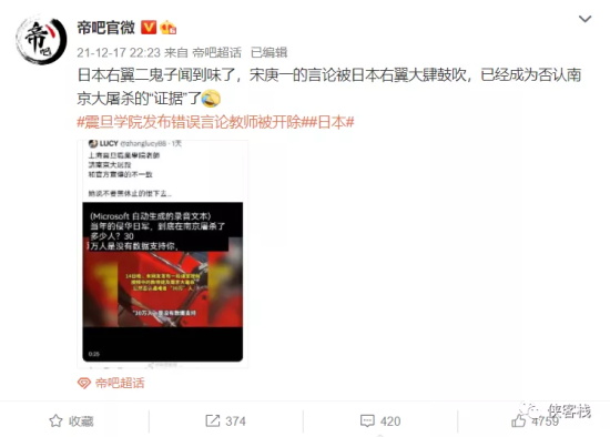 知名记者、博主@徐记观察 指出的更是让人震惊,为宋庚一洗地、美化日本军国主义,已经不仅仅是精日、日杂势力这么简单了,而是已经有境外反华势力全面介入了。