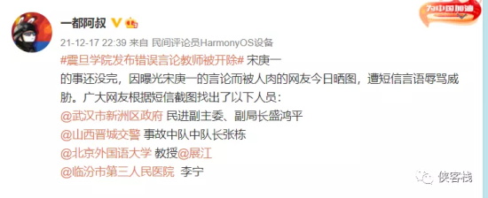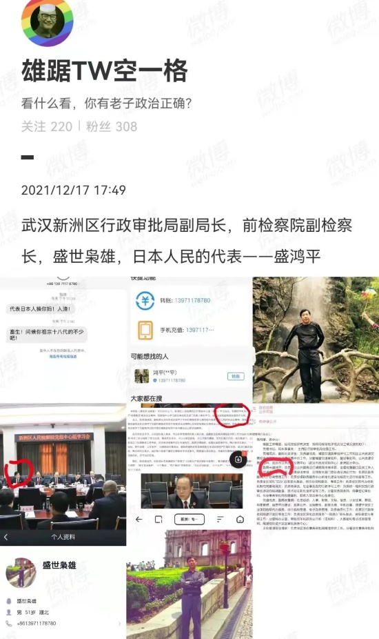比如,有网民指出攻击爱国学生的精日中,有一个是武汉新洲区行政审批局现副局长、前检察院副检察长,还是民进区工委的副主委。
