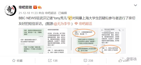 比如知名博主@帝吧官微 发现,反华媒体BBC驻武汉的记者“tony秀儿”[doge],对网暴上海大学生的疑似参与者进行了亲切友好的短信采访。
