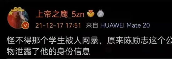 首先,据知名博主@上帝之鹰 指出,泄露举报精日教师的爱国学生身份信息的是“陈励志”。