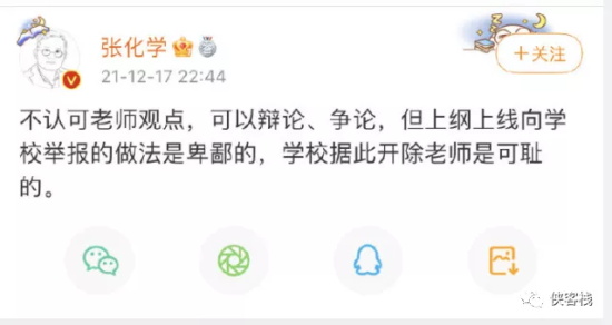 微博房地产大V@张化学 发帖攻击爱国学生可耻、学校开除老师可耻。
