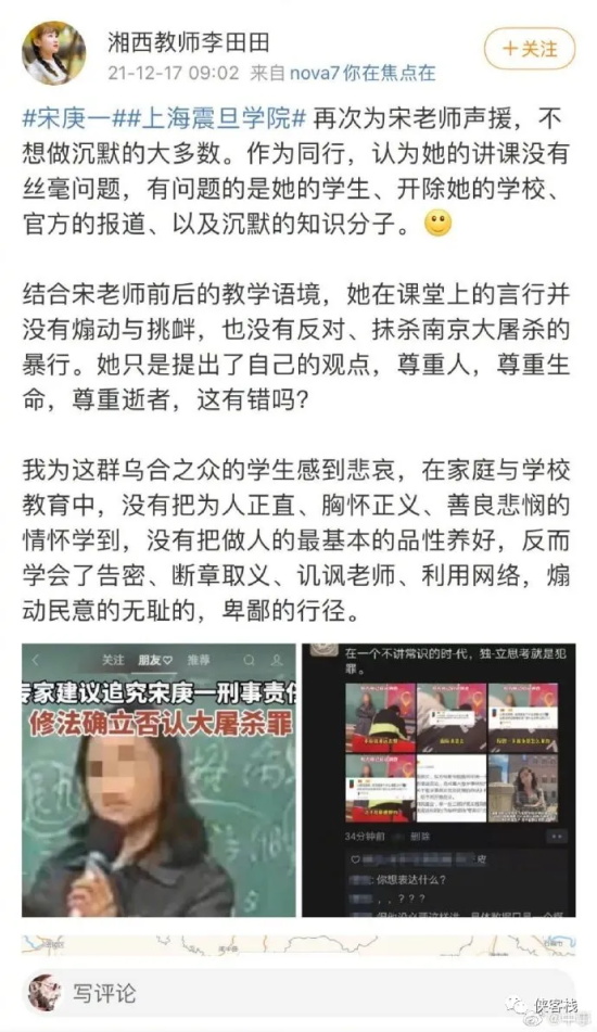比如有个名为“湘西教师李田田”的微博用户美化宋庚一是尊重人、尊重生命、尊重逝者而攻击爱国学生是“乌合之众”、“煽动民意”。