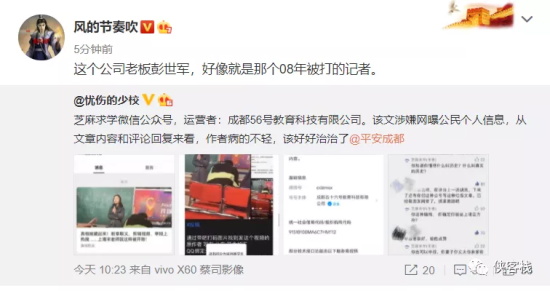 网民@忧伤的少校 指出:芝麻求学微信公众号,运营者:成都56号教育科技有限公司。该文涉嫌网曝公民个人信息,从文章内容和评论回复来看,作者病的不轻,该好好治治了@平安成都
