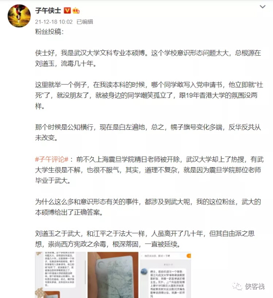 这个武汉大学学生指出:这里就举一个例子,在我读本科的时候,哪个同学敢写入党申请书,他立即就“社死”了,就没朋友了,就被身边的同学嘲笑孤立了,跟19年香港大学的氛围没两样。