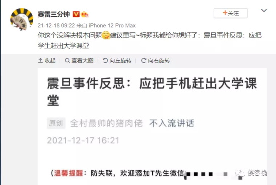 比如公众号“不入流讲话”妄称“震旦事件反思:应把手机赶出大学课堂”。