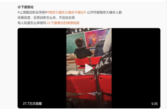 上海震旦职业学院东方电影学院女教师宋庚一,因在课堂上公然质疑南京大屠杀、妄图为日本军国主义及法西斯招魂,被爱国学生举报,然后引发全国人民愤怒,人民日报、共青团中央、紫光阁等主要国字号纷纷发声谴责。