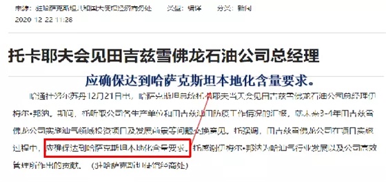 所以2017年虽然出台了上述法律,但没有怎么推行。直到托卡耶夫2019年上台,其开始认真地推行此条款。除了前面12月21日他会见田吉兹雪佛龙石油公司总经理刻意强调外,搜索哈萨克斯坦本地化含量新闻,你可以发现这是2021年的一个高频词。