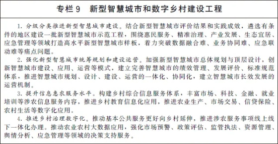 (三)推动数字城乡融合发展。统筹推动新型智慧城市和数字乡村建设,协同优化城乡公共服务。深化新型智慧城市建设,推动城市数据整合共享和业务协同,提升城市综合管理服务能力,完善城市信息模型平台和运行管理服务平台,因地制宜构建数字孪生城市。加快城市智能设施向乡村延伸覆盖,完善农村地区信息化服务供给,推进城乡要素双向自由流动,合理配置公共资源,形成以城带乡、共建共享的数字城乡融合发展格局。构建城乡常住人口动态统计发布机制,利用数字化手段助力提升城乡基本公共服务水平。