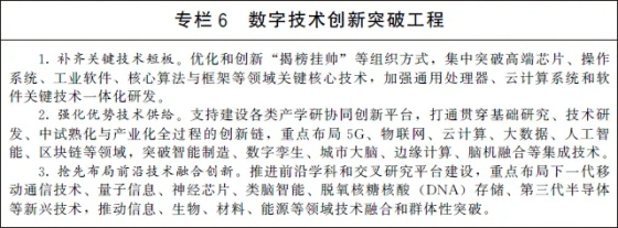 (一)增强关键技术创新能力。瞄准传感器、量子信息、网络通信、集成电路、关键软件、大数据、人工智能、区块链、新材料等战略性前瞻性领域,发挥我国社会主义制度优势、新型举国体制优势、超大规模市场优势,提高数字技术基础研发能力。以数字技术与各领域融合应用为导向,推动行业企业、平台企业和数字技术服务企业跨界创新,优化创新成果快速转化机制,加快创新技术的工程化、产业化。鼓励发展新型研发机构、企业创新联合体等新型创新主体,打造多元化参与、网络化协同、市场化运作的创新生态体系。支持具有自主核心技术的开源社区、开源平台、开源项目发展,推动创新资源共建共享,促进创新模式开放化演进。
