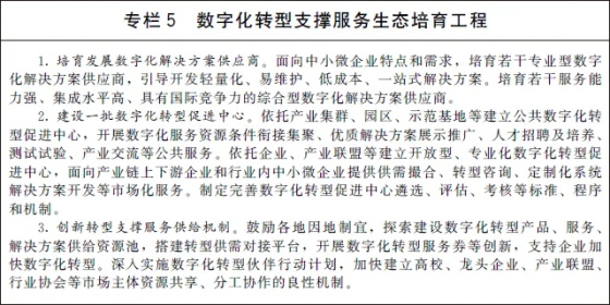 (一)加快企业数字化转型升级。引导企业强化数字化思维,提升员工数字技能和数据管理能力,全面系统推动企业研发设计、生产加工、经营管理、销售服务等业务数字化转型。支持有条件的大型企业打造一体化数字平台,全面整合企业内部信息系统,强化全流程数据贯通,加快全价值链业务协同,形成数据驱动的智能决策能力,提升企业整体运行效率和产业链上下游协同效率。实施中小企业数字化赋能专项行动,支持中小企业从数字化转型需求迫切的环节入手,加快推进线上营销、远程协作、数字化办公、智能生产线等应用,由点及面向全业务全流程数字化转型延伸拓展。鼓励和支持互联网平台、行业龙头企业等立足自身优势,开放数字化资源和能力,帮助传统企业和中小企业实现数字化转型。推行普惠性“上云用数赋智”服务,推动企业上云、上平台,降低技术和资金壁垒,加快企业数字化转型。