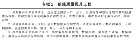 (一)强化高质量数据要素供给。支持市场主体依法合规开展数据采集,聚焦数据的标注、清洗、脱敏、脱密、聚合、分析等环节,提升数据资源处理能力,培育壮大数据服务产业。推动数据资源标准体系建设,提升数据管理水平和数据质量,探索面向业务应用的共享、交换、协作和开放。加快推动各领域通信协议兼容统一,打破技术和协议壁垒,努力实现互通互操作,形成完整贯通的数据链。推动数据分类分级管理,强化数据安全风险评估、监测预警和应急处置。深化政务数据跨层级、跨地域、跨部门有序共享。建立健全国家公共数据资源体系,统筹公共数据资源开发利用,推动基础公共数据安全有序开放,构建统一的国家公共数据开放平台和开发利用端口,提升公共数据开放水平,释放数据红利。