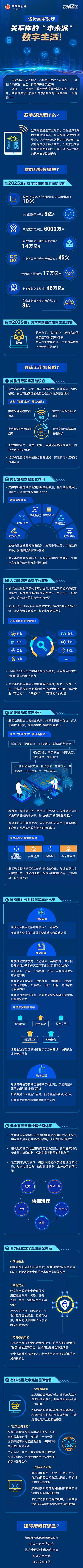 展望2035年,数字经济将迈向繁荣成熟期,力争形成统一公平、竞争有序、成熟完备的数字经济现代市场体系,数字经济发展基础、产业体系发展水平位居世界前列。