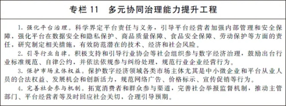 (三)完善多元共治新格局。建立完善政府、平台、企业、行业组织和社会公众多元参与、有效协同的数字经济治理新格局,形成治理合力,鼓励良性竞争,维护公平有效市场。加快健全市场准入制度、公平竞争审查机制,完善数字经济公平竞争监管制度,预防和制止滥用行政权力排除限制竞争。进一步明确平台企业主体责任和义务,推进行业服务标准建设和行业自律,保护平台从业人员和消费者合法权益。开展社会监督、媒体监督、公众监督,培育多元治理、协调发展新生态。鼓励建立争议在线解决机制和渠道,制定并公示争议解决规则。引导社会各界积极参与推动数字经济治理,加强和改进反垄断执法,畅通多元主体诉求表达、权益保障渠道,及时化解矛盾纠纷,维护公众利益和社会稳定。