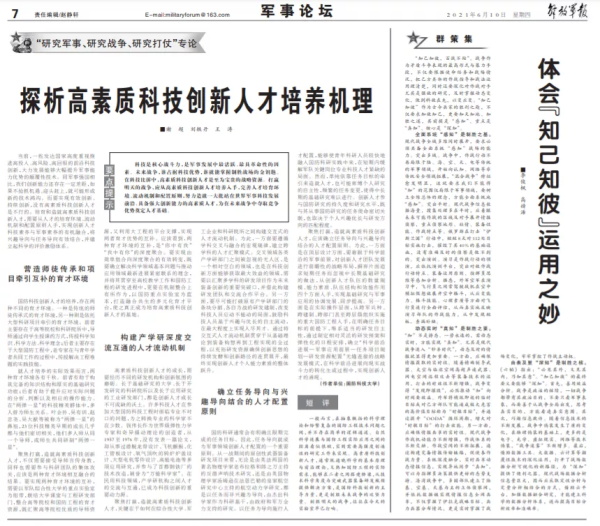 6月10日的《解放军报》第7版刊登了一篇专论《探析高素质科技创新人才培养机理》: