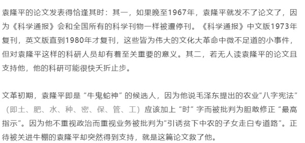 袁隆平院士的那篇论文的确具有某种历史偶然性,可以被后世写历史的人拿去杜撰“伤痕”;但杂交育种却并不会因为一篇论文的“有无”,产生两种截然不同的结果,在举国一盘棋的战略部署之下,杂交水稻在毛泽东时代的研制成功是具有历史必然性的,唯一的影响就是“杂交水稻之父”的称号会因此易人。