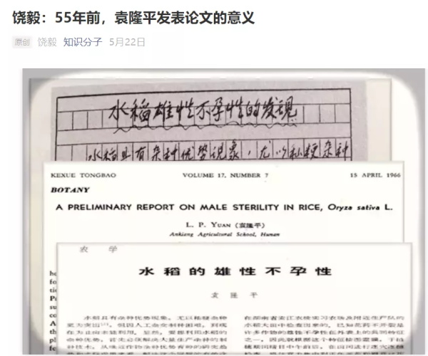 上个月,袁隆平院士去世,引发了举国哀悼。北京大学生命科学院院长饶毅在他的公众号“知识分子”发表了一篇《55年前,袁隆平发表论文的意义》,引发了广泛传播。