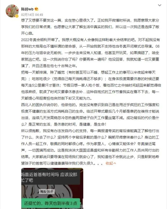 “为了开幕式,张导把每一天都排满,吃饭很少,在身体极度需要休息的时候,还要每天走5公里暴汗才罢休……而张导完全没有意识到自己是在用近乎疯狂的工作强度和极度不健康的生活方式消耗自己的生命。”