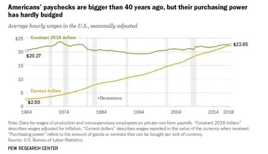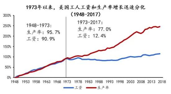 从上图中可以看出,1973年以后,实际上是1964年以后,美国工人收入基本上就没怎么增长,甚至很多年份还在下跌。而与之对比的是,在1948年到1973年之间,劳动生产率和工资基本上是同等幅度增长。