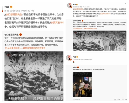 比如演员柯蓝,连续对多个公知的所谓的“反战”帖子转发、点赞甚至是献花,立场极其鲜明。