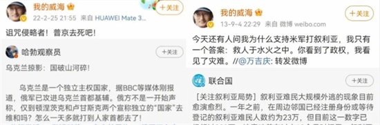 比如下面这个网民,在美国入侵叙利亚的时候,他叫嚣“救人于水火之中,你看到了政权,我看到了灾难”。而俄罗斯攻打乌克兰时,他却来个大变脸,说什么“诅咒侵略者,普京去死”吧。