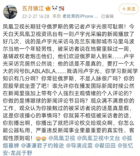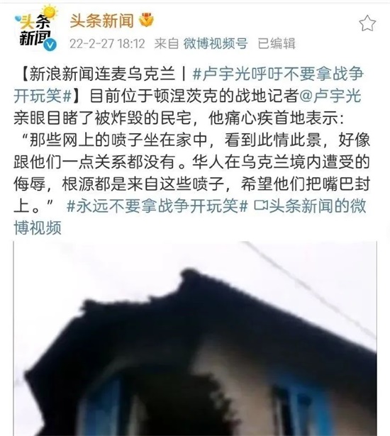 凤凰周刊官微发布视频消息,是记者在顿涅茨克的现场视频,该记者在视频里不仅仅把乌克兰军队发导弹打了居民楼的事儿给按在俄军头上,还污蔑称“华人在乌克兰境内遭受的敌对和侮辱,根本都是来自中国的喷子”。