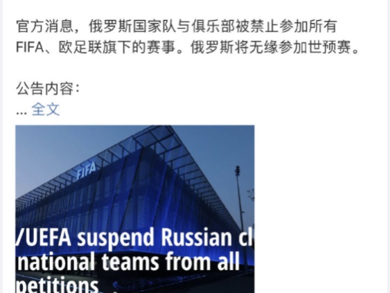 比如俄罗斯足球国家队与俄罗斯的足球俱乐部被欧足联、国际足联宣布禁赛,甚至于国际奥委会也建议全球体育组织和赛事不邀请或不允许俄罗斯和白俄罗斯运动员参赛。