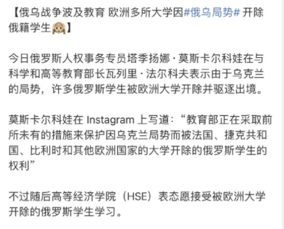 比如欧洲的各所大学,居然悍然的无端开除了俄罗斯的留学生。那么所谓的教育无国界、教育远离政治呢?
