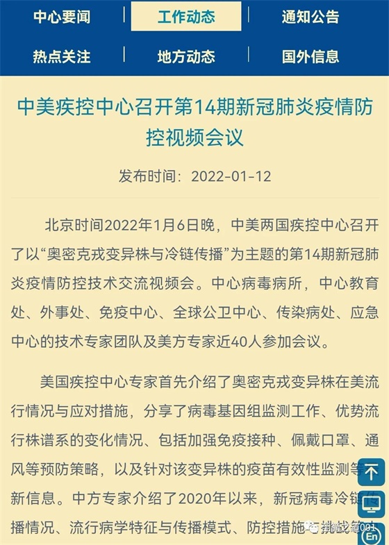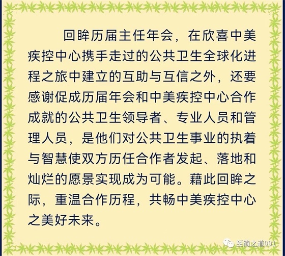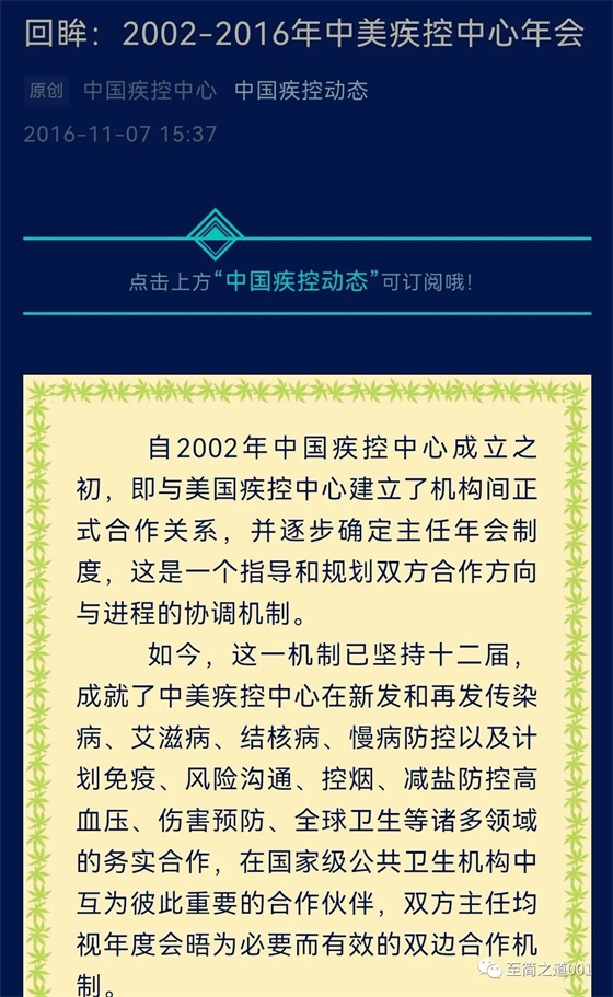 中疾控2016年11月7日的《回眸:2002-2016年中美疾控中心年会》一文说:自2002年中国疾控中心成立之初,即与美国疾控中心建立了机构间正式合作关系,并逐步确定主任年会制度。这是一个指导和规划双方合作方向与进程的协调机制。如今这一机制已坚持十二届,成就了中美疾控中心在新发和再发传染病、艾滋病、结核病、慢病防控以及计划免疫、风险沟通、控烟、减盐防控高血压、伤害预防、全球卫生等诸多领域的务实合作,在国家级公共卫生机构中互为彼此重要的合作伙伴。双方主任均视年度会晤为必要而有效的双边合作机制。回眸历届主任年会,在欣喜中美疾控中心携手走过的公共卫生全球化进程之旅中建立的互助与互信之外,还要感谢促成历届年会和中美疾控中心合作成就的公共卫生领导者、专业人员和管理人员。是他们对公共卫生事业的执着与智慧,使双方历任合作者发起、落地和灿烂的愿景实现成为可能。藉此回眸之际,重温合作历程,共畅中美疾控中心之美好未来。