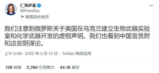 在俄方召开发布会前一天,白宫新闻秘书普萨基连发8条推文掩饰心虚,先是指责俄罗斯发表虚假信息,后又称中国是在“附和阴谋”。