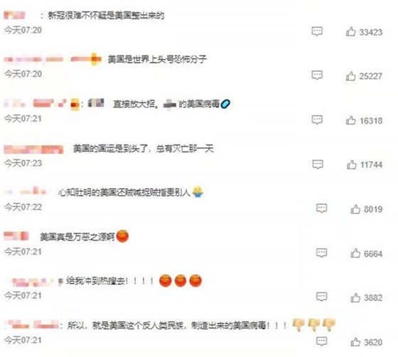 消息一出,再次引爆国内网友的愤怒,网友评论说“这明明是美国在制造病毒!美国贼喊捉贼!”“美国反人类应该受到制裁!”“最初传出新冠来源于蝙蝠是故意发出来的谣言”。