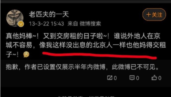 2013年时,“老匹夫的一天”发帖说“像我这样没出息的北京人一样也TM得交租子”。