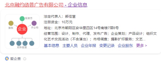 网上公开信息显示,北京融约函普广告有限公司位于北京市朝阳区安华里四区14号南楼7层8号。