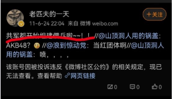 比如在7月9日,这个账号更更更嚣张了,居然公然侮辱人民军队。