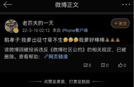 其在3月10日的帖子说“鹅孝子:我爹出征寸草不生,我爹好棒棒”。