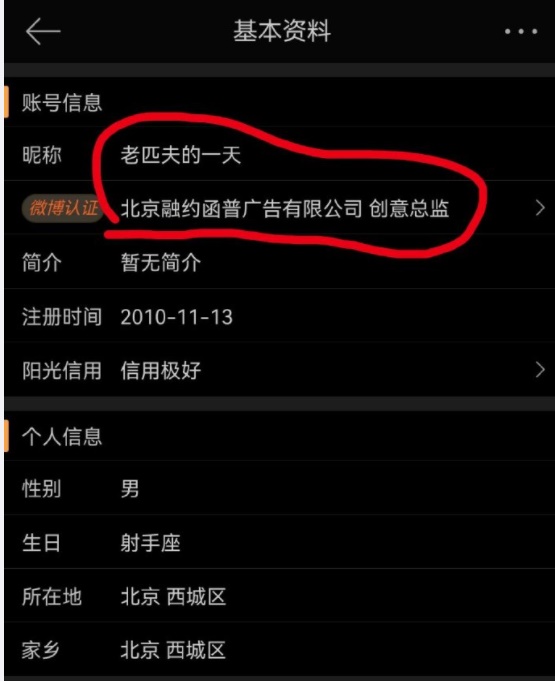这个账号,网名“老匹夫的一天”,微博认证为北京融约函普广告有限公司的创意总监。