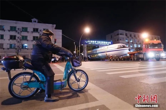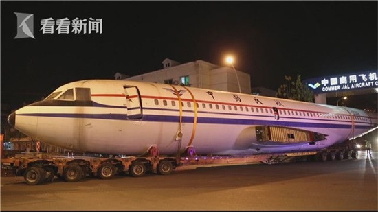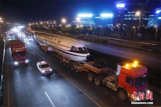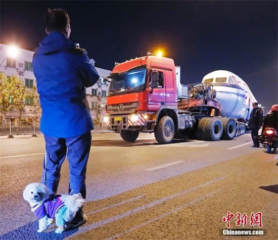 2017年12月25日夜,一架被拆解的飞机装在平板车上,在交警的护卫下穿过寂静的上海街头。