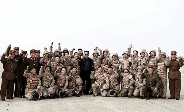 【朝鲜领导人金正恩与参加新型洲际弹道导弹试射的朝鲜军人们合影留念。】
