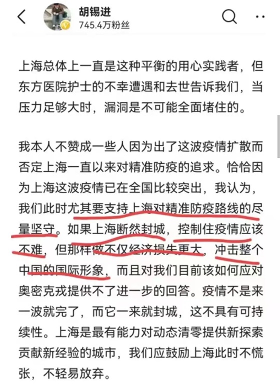 美国送来了这么好的药,可不能辜负了人家美国的好心,得想办法让中国人都能早点用上美国特效药,感受一下来自大洋彼岸的温暖。于是胡锡进站出来说,如果上海断然封城,控制住疫情应该不难,但那样做不仅经济损失更大,冲击整个中国的国际形象,而且对我们目前该如何应对奥密克戎提供不了进一步的回答。