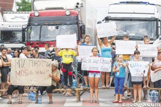 (上图:在乌克兰西部城市乌日哥罗德附近的一个小镇,有居民在来往首都基辅一条高速公路上,以卡车列阵阻挡交通举牌示威,牌子上写道:“让我们和平解决问题!”、“别让我们的儿子丈夫牺牲!”、“为什么没人听我们说话?”)