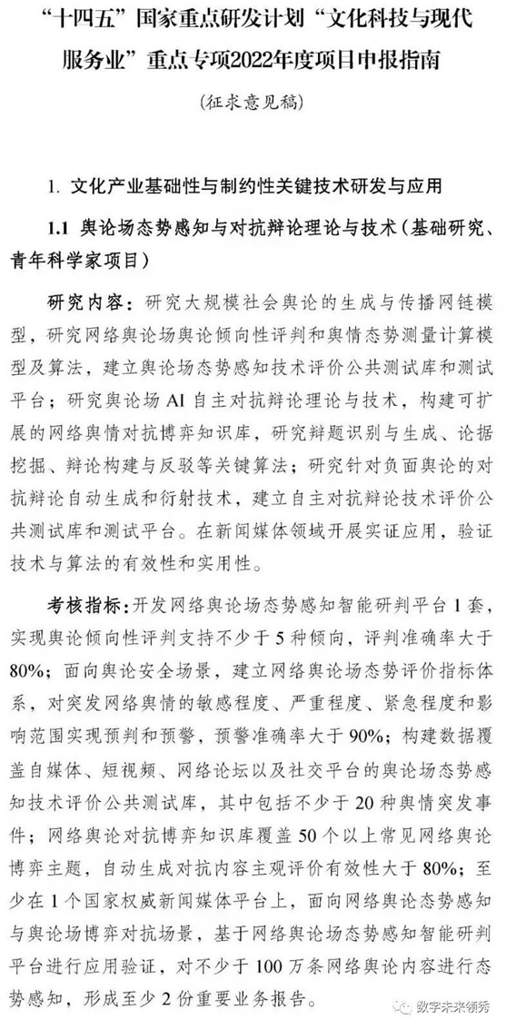 人类文化的进化:结绳纪事-文墨记事-信息化数字化记事-大数据记录-txtDNA 二,具体案例: 实现一篇文章的txtDNA认知图谱或思维图谱 (参见链接:习大大联合国讲话--数据基因可视化示例:舒之弥四海,卷之不盈杯)部分txtDNA认知图谱或思维图谱可视化化效果如下: 一个领导人一段时期(甚至全部)所有讲话和文字大数据可以提取他的txtDNA认知图谱或思维图谱。 (上面的一篇文章可以实现,同理,这一步的实现也是确定的,只不过需要足够多的数据。) 每个领导可以产生各自的txtDNA认知图谱或思维图谱。 4,领导(大小)集体txtDNA认知图谱或思维图谱,与整个国家的治理结果存在对应关系,与各个领导人的txtDNA认知图谱或思维图谱构成国家治理的共同思想平台的研究要素。 通过智库研究院的人工,分析共同思想平台的研究要素与国家治理各方面最终成果的好坏成败情况,从而通过txtDNA认知图谱或思维图谱直观显示上下左右大家都认同的五位一体统一治理标准。 三,简约框架: 各方面主导者~ 认知、思维、思想观念(能动性)~ 自然语言(手段)~ 文字文本大数据(形式)~ 输入-处理-输出(治理体系)+融媒体网络(平台)=共同思想平台~ 公众认知(舆情)+实际治理成果 四,应用于舆论场态势感知等其他领域: 舆论场不仅包括国家或地方主体,还包括国外主体和各种利益集团主体。一个舆论场主体一段时期所有发布的本大数据可以提取他的txtDNA认知图谱或思维图谱。每个舆论场主体可以产生各自的txtDNA认知图谱或思维图谱。舆论场(不同行业不同层面)整体的集体txtDNA认知图谱或思维图谱,与对应的公众认知结果存在对应关系,与各个主体的txtDNA认知图谱或思维图谱构成舆论场态势感知平台的研究要素。 通过智库研究院的人工,分析各个舆论场主体txtDNA认知图谱或思维图谱在媒体平台分布情况与公众最终形成各方面认知的情况,从而可能通过txtDNA认知图谱或思维图谱直观显示上下左右大家都认同的统一舆论对抗辩论重点攻防领域和舆论认知战同步变化趋势。 五,txtDNA认知图谱、思维图谱为实现以下国家重点研发提供底层技术支撑(见人工智能背景参考及附件4): 大规模社会舆论的生成与传播链模型; 网络舆论场舆论倾向性评判和舆情态势测量计算模型及算法,建立舆论场态势感知技术评价公共测试库和测试平台; 延伸舆论场AI自主对抗辩论理论与技术,构建可扩展的网络舆情对抗博弈知识库, 辩题识别与生成、论据挖掘、辩论构建与反驳等关键算法; 研究针对负面舆论的对抗辩论自动生成和衍射技术,建立自主对抗辩论技术评价公共测试库和测试平台。 在新闻媒体领域开展实证应用,验证技术与算法的有效性和实用性。 六,大道至简的基础科学发现与发明技术txtDNA认知图谱、思维图谱的应用产品联合研发 二进制的本质是同出而异名;txtDNA认知图谱、思维图谱的本质是同出而同名。 作为一项大道至简的科学发现和技术发明,其提供了类似计算机二进制的底层技术支持,具体行业场景下应用工具的产品研发,可以与拥有应用场景和数据优势的机构合作伙伴联合完成。 例如,社会治理、媒体动态、文化传播、全息全脑全生命教育、生活消费等领域的软硬件解决方案,从而开发出来开发框架和基础技术服务平台。 具体产品可以是个性化学习体系,情报分析,专家经验深度融合平台,紧抓面向基础技术服务、研发预测与推理等智能计算需求。 七,人工智能背景参考及附件: 4,“十四五”国家重点研发集合“文化科技与现代服务业”重点专项2022 1文化产业基础性与制约性关键技术研发与应用 1.1 舆论场态势感知与对抗辩论理论与技术 来源:数字未来领秀微信号