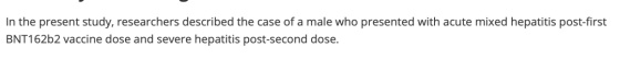 在本研究中,研究人员对一名接种两剂辉瑞新冠疫苗的52岁男子进行了临床研究,该男子首次接种疫苗后出现急性混合肝炎,第二次接种后出现重度肝炎。