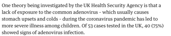 英国卫生安全局正在调查的一项理论是,在大流行期间,缺乏接触常见腺病毒(通常会导致胃部不适和感冒)导致儿童患上更严重的疾病。在英国检测的53例病例中,40例(75%)表现出腺病毒感染的迹象。