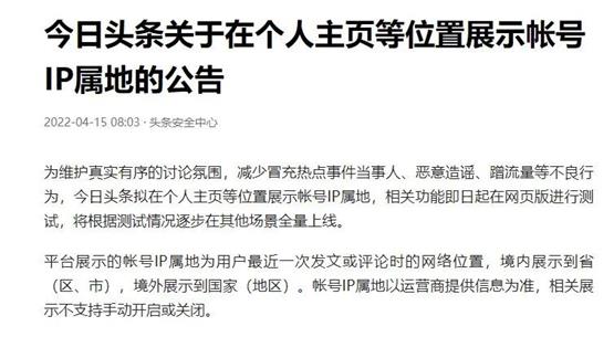 除了微博,今日头条、抖音、知乎、小红书等平台也纷纷宣布将上线显示“IP属地”功能,用户在发送内容或发表评论时,都会展示你的IP属地。