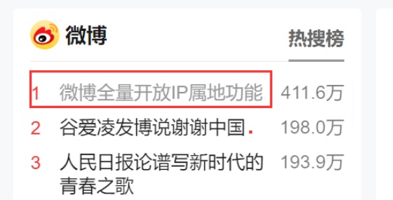#微博全量开放IP属地功能#消息公布后迅速登上微博热搜第一。