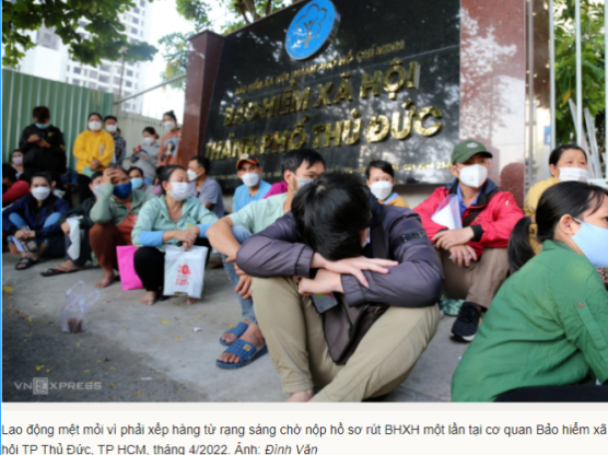 比如说越南胡志明市首德市社保局门口,大批疲惫不堪的劳动者从凌晨就到此排队,为的是提交取出社保款的申请。