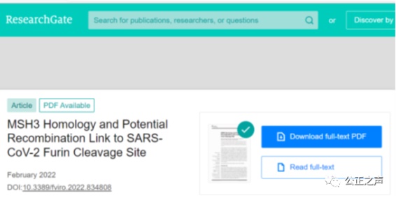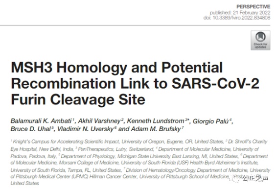 2022年2月21日,德国网站“研究大门”(ResearchGate.net)发表了重磅文章,标题是“MSH3 Homology andPotential Recombination Link to SARS-CoV-2 Furin Cleavage Site”,中文为《MSH3同源性与新冠病毒SARS-CoV-2 Furin酶剪切位点的潜在重组链接》。下面我们把文章的标题简称为《MSH3同源性与新冠病毒》。文章内容见参考文献[1]、[2]。