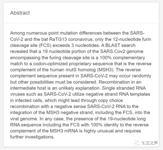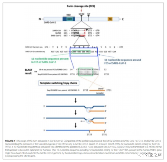在新冠病毒(SARS-CoV-2)和蝙蝠RaTG13冠状病毒之间的众多点突变差异中,只有12核苷酸呋喃裂解位点(FCS)超过3个核苷酸。数据库BLAST搜索显示,SARS的19个核苷酸部分包含发酵裂解位点的Cov2基因组与密码子优化的专有序列100%互补匹配,该序列是人类mutS同系物(MSH3)的反向补充。SARS-CoV-2 中存在的反向补体序列可能是随机发生的,但必须考虑其他可能性。中间宿主的重组是一种不太可能的解释。SARS-CoV-2等单链RNA病毒利用受感染细胞中的负链RNA模板,这可能导致通过具有负感SARS-CoV-2 RNA的拷贝选择重组将MSH3阴性链(包括FCS)整合到病毒基因组中。在任何情况下,19-核苷酸长RNA序列的存在,包括与MSH3 mRNA反向补体具有100%同一性的FCS是非常不寻常的,需要进一步研究。