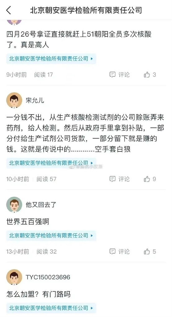 只是在网传笑话里有人问如何加盟核酸检测点,这家叫做朝安医学检验所的公司已经比加盟更进一步,在北京朝阳宣布提升管控的第二天就成立公司,承担大规模的核酸检测任sheng务yi了。