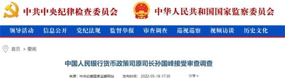 5月18日,中央纪委国家监委网站发布消息称,央行货币政策司原司长孙国峰涉嫌严重违纪违法,目前正接受纪律审查和监察调查。孙国峰于当日上午被带走。